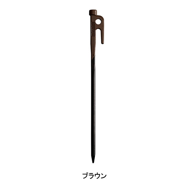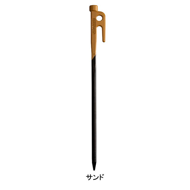 ペグを地面に打ち込む際の適正角度である45度を、一目で確認できるようカラーリングしている長さ30cmの鍛造ペグ。