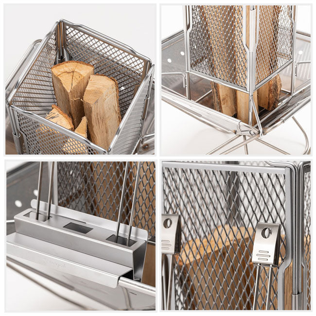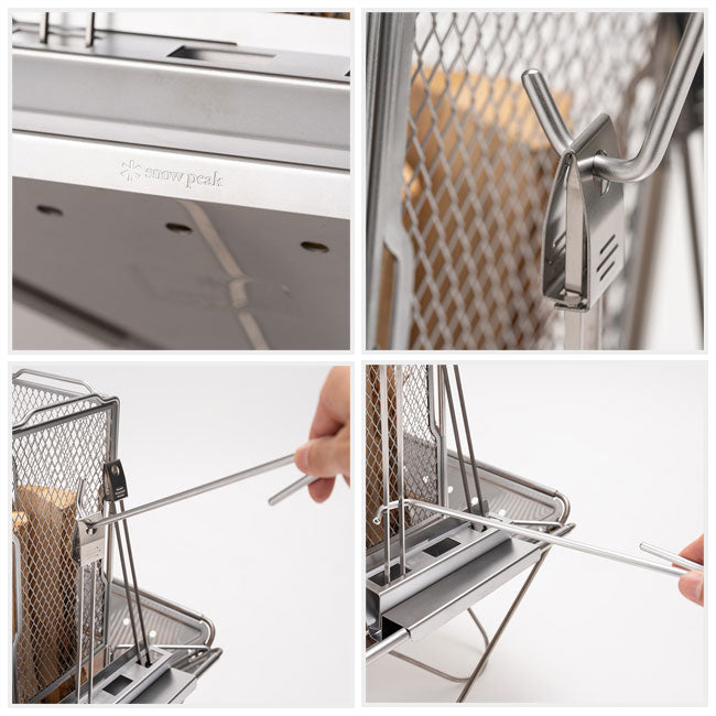 遠赤外線の力で旨みを凝縮し、焚火調理の幅が広がる「セイエン」。 日本の伝統的調理法「原始焼き」を焚火台Lで楽しむことができます。 自然の中で楽しめる炉端焼きを焚火台囲んでファミリーやグループで楽しんでみませんか。 「原始焼き」や「囲炉裏料理」は、料亭などで出されるように主に炭を熱源とした調理法ですが、その調理の楽しさを自然の中で楽しんでいただけるよう、開発されたアイテムが「セイエン」です。 この調理法の特徴として、食材を串に刺し、遠赤外線でじっくりと焼き上げることで余分な脂や水分が落ちるため、旨みが凝縮し魚や肉が格段に美味しくいただくことができます。 また、食材の焼き加減を調整できるよう、スキュアの傾斜を変えることで「調理」と「保温」を実現しています。 逆さまにすることもでき、食材の焼きムラをなくすよう、細部までこだわった製品となっております。 キャンプの醍醐味となる焚火の炎を楽しみながら、こだわり抜いた調理を楽しむことができることも魅力のひとつです。 ※こちらの製品は、焚火台L(ST-032R、ST-032RS)専用のオプション品です。 焚火台Lの使用状況(長年の使用や急冷による変形状況)による焚火台のパネルの変形により安全に組み付けることができない可能性があります。 ご購入の前に、お持ちの焚き火台Lの歪みの程度をご確認ください。 ※ご使用できないほどの変形・歪みの目安は「焚火台Lの折り畳み時に開口部を閉じることができず、3cm以上空いているもの」です。 【セット内容】 セイエン本体×1、スキュア×4、串置き台×2 【重量】 セイエン本体:2.6kg 串置き台:550g スキュア:80g オプションフック10g 【材質】 ステンレス |