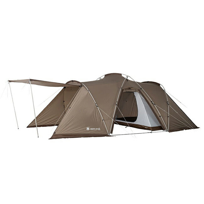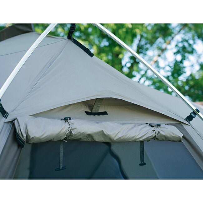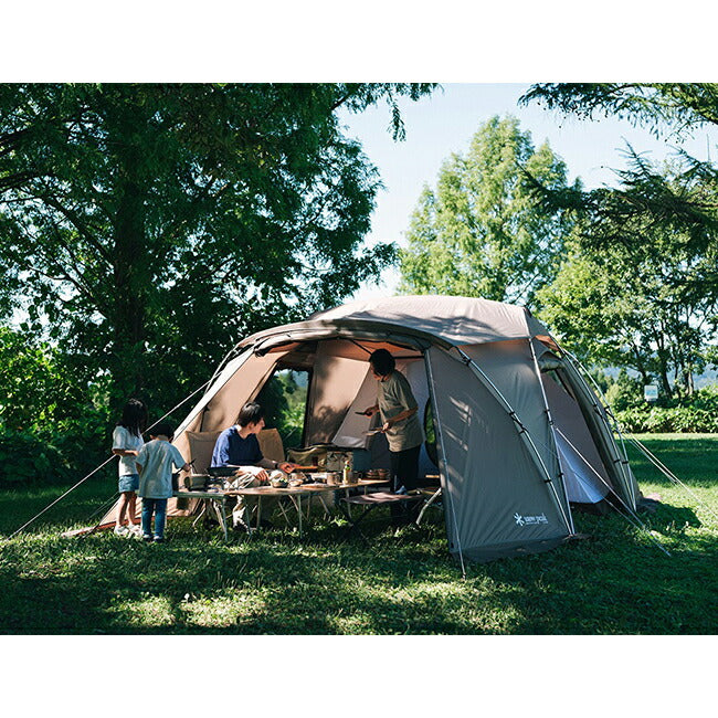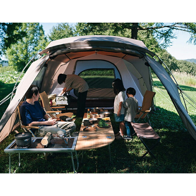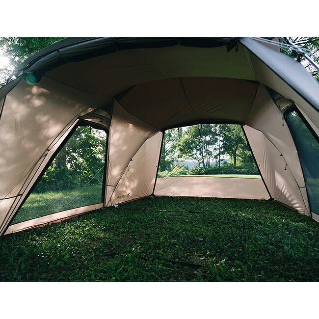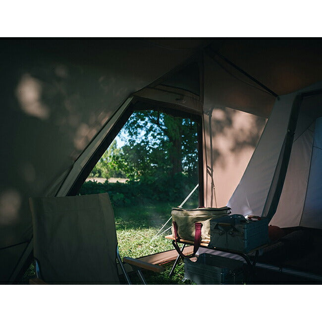 家族4人でゆったり使える、こだわりの居住空間。 簡単設営のオールシーズン対応2ルームシェルター。 エントリーキャンパーにも最適な「ランドネストシェルター」は、簡単な設営と快適な居住性を両立させた、家族4人でも広々と使える2ルームシェルターです。 リビングと寝室が一体となっている2ルームシェルターは設営が一度で済むうえ、寝室である吊り下げ式のインナールームを外せば大型シェルターとしても活用できます。 エントリーキャンパーからファミリー層などの幅広いニーズに応える、利便性と耐久性を兼ね備えたモデル、「ランドネストシェルター」。 ランドネストドームのフレームワークをベースに設計し、メインフレームが容易に立ち上げられる点や、前後左右が対称の構造により、初心者でも迷わず簡単に設営できるシンプルな設計が特長です。 また、オールシーズン活躍できるスペックになっており、夏の強い日差しには天井部分の遮光ピグメントが日光を遮り、4箇所ある大きなメッシュパネルが通気性を高めます。 シェルターの全周には冷気の侵入を防ぐスカートが施されているため、寒い季節にも快適な空間を提供します。 また、シンプルなフレーム構成で設営も簡単。 年間を通して快適に過ごせる、どなたでもご使用いただける2ルームシェルターです。 【重量】 16.5kg 【セット内容】 インナールーム フライシート リッジポール(×1) Aフレーム(×2) Cフレーム(×2) ジェラルミンペグ(21cm×18) 自在付ロープ(3.5m×4、2.5m×8) キャリーバッグ フレームケース ペグケース 【対応人数】 4名< 【材質】 本体(ルーフ部):75Dポリエステルタフタ・遮光ピグメントPUコーティング耐水圧1,800mmミニマム・撥水加工・UVカット加工 本体(ウォール部):75Dポリエステルタフタ・PUコーティング耐水圧1,800mmミニマム・撥水加工・UVカット加工 本体(スカート部):210Dポリエステルオックス・PUコーティング耐水圧450mmミニマム・撥水加工 インナーウォール:68Dポリエステルタフタ ボトム:210Dポリエステルオックス・PUコーティング耐水圧1,800mmミニマム フレーム:A6061(φ17.5mm、φ16mm) |