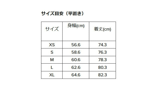 サイズ | S:身幅58.6 着丈76.3 M:身幅60.6 着丈78.3 L:身幅62.6 着丈80.3 XL:身幅64.6 着丈82.3 (単位:cm) ※メーカーサイズ参照 |