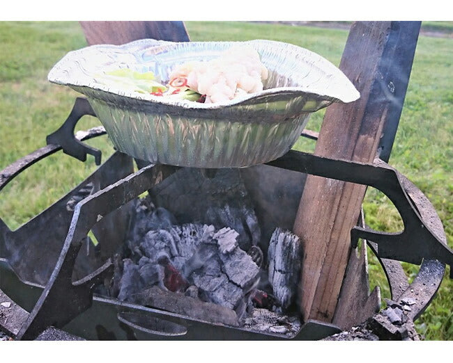 スキレットやフライパン調理にもってこいの、GURU GURU FIRE専用オプションパーツ【GOTOKU】 本品はGURU GURU FIRE Sサイズ/Mサイズどちらにもコレ1つで対応。 ジョイント部分となる凹みが2箇所設けられており、 内側の凹みはSサイズに、外側の凹みはMサイズに、それぞれ適応します。 調理器具が滑り落ちないよう、調理器具が触れる面(GOTOKUの頂点部)は、 中心に向かって徐々にさがる階段状の段差を設けました。 また、薪を追加投入しやすいよう、GOTOKUのジョイント部(脚)自体を少し高く設計。 使い方は至ってシンプルで、 GOTOKUをクロスさせ切り込み部分をジョイント。 あとはGURUGURU FIREの最上部のリングにはめ込むだけです。 GURUGURU FIRE S/Mに同梱収納可能なコンパクト仕様です。 重量 : 278g 材質 : 鉄 セット内容 : 1セット/2本 備考 : ジョイント部分(くぼみ)2か所で、GURUGURU FIRE S/Mサイズどちらにも適応 |