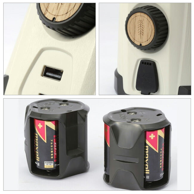 ライトのヘッドを最高66まで伸ばして、上からテーブルを照らす新感覚のLEDランタン。LED灯からの光が直接目に入ることが少なく、快適で明るい夜の空間を演出してく れます。光量はウッディなダイヤルを回すことで調整できます。正面下部のUSB出力ポートからモバイルを充電でき、ハンディバッテリーとしての機能も果たします。 重量:1.9 (電池含む) 電池:単1アルカリ電池×6本(別売) 明るさ:360ルーメン(収納時) 500ルーメン(伸ばした時) 耐水性:IPX-4 点灯時間:ハイビーム/33時間 ロービーム/200時間 レインボー/800時間 |