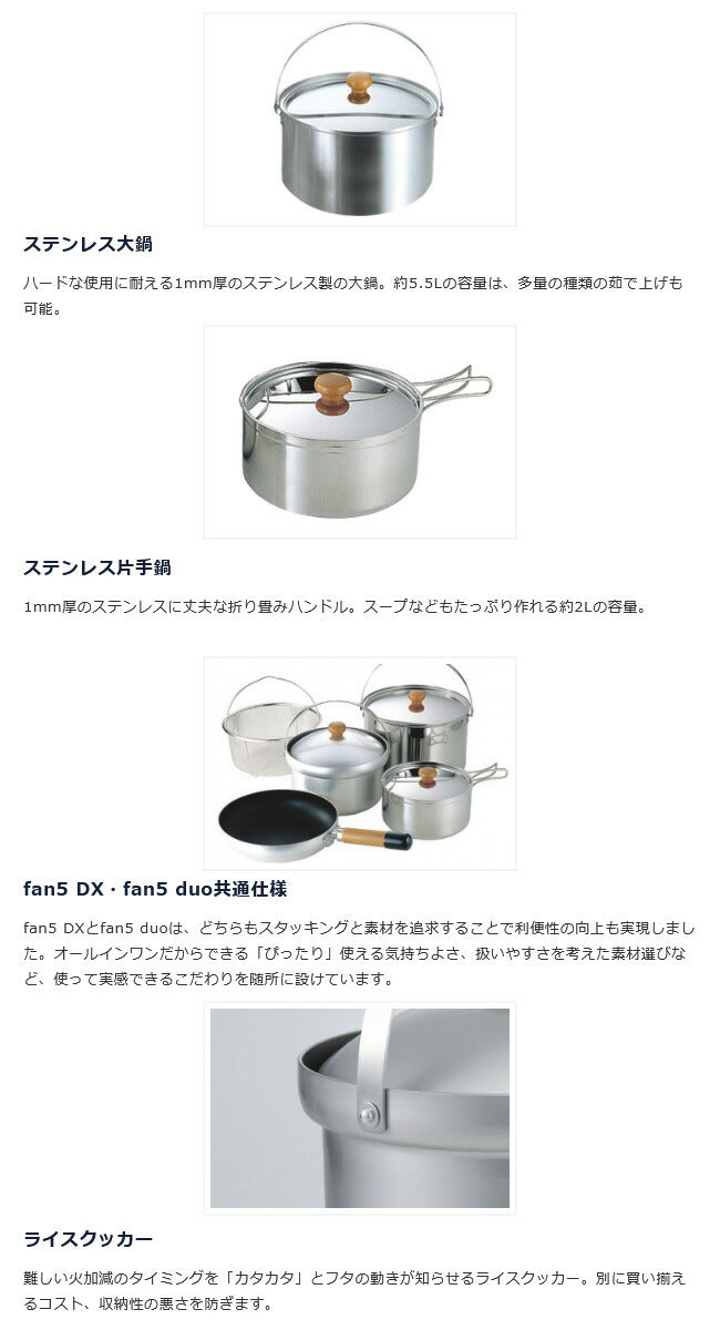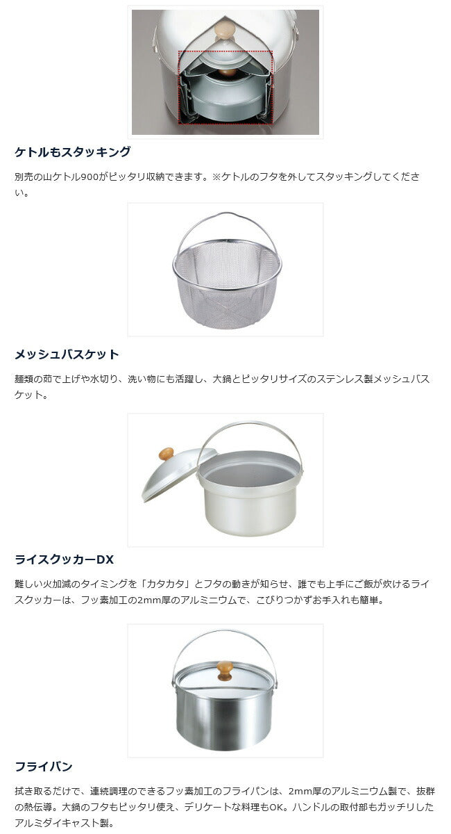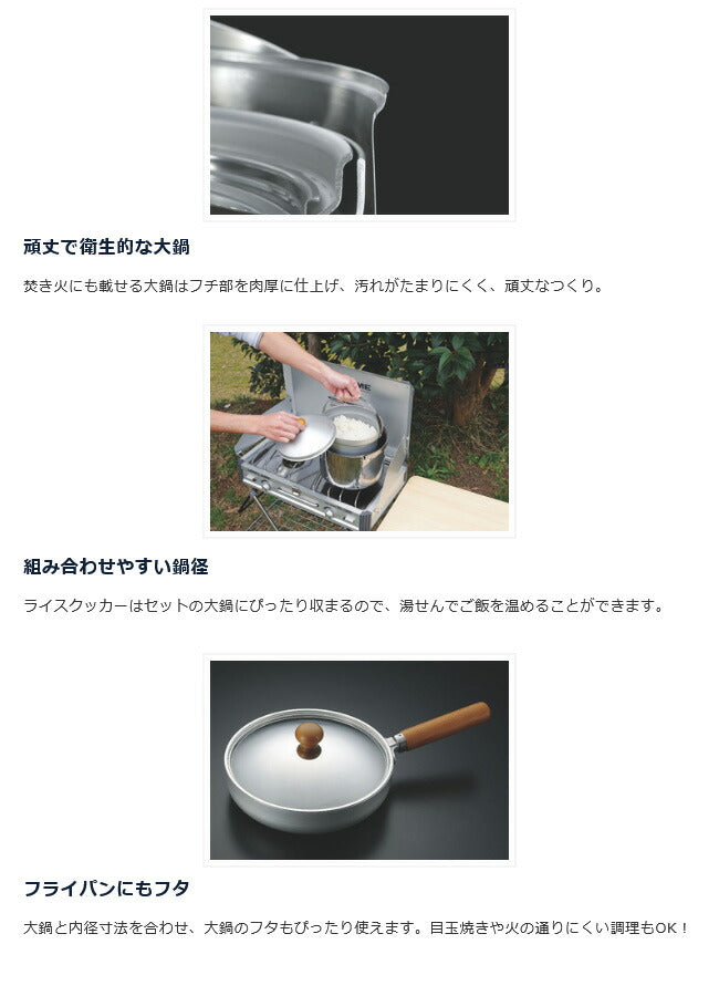 | サイズ | ライスクッカーDX:約φ210×115mm フライパン:約φ225×50mm ステンレス大鍋:約φ230×145mm ステンレス片手鍋:約φ170×90mm メッシュバスケット:約φ210×110mm 収納時:約φ230×195mm ※メーカーサイズ参照 |