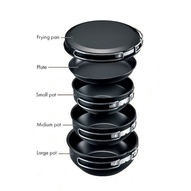 サイズ | 収納時:約φ16.2×7.3(高さ)cm 大鍋:約Φ14.2×6.5(深さ)cm 中鍋:約φ13.3×5.5(深さ)cm 小鍋:約φ12.4×5.2(深さ)cm フライパン:約φ15.2×2.3(深さ)cm 皿:約φ13.8×1.9(深さ)cm ※メーカーサイズ参照 |