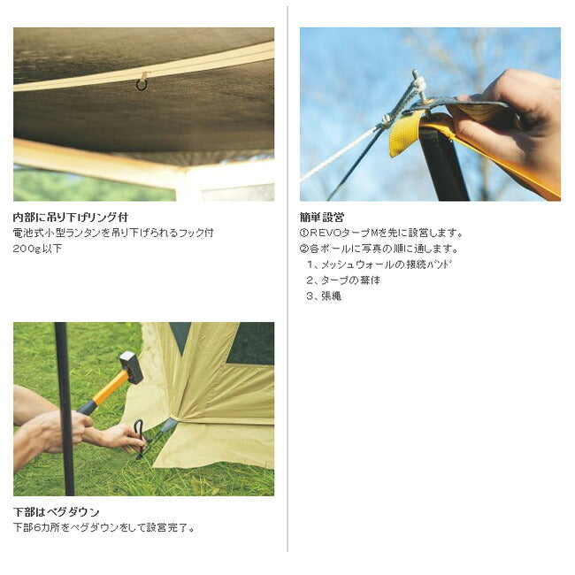 REVOタープをより快適にするオプション 通気性を確保しながらも不快な虫や雨風の侵入を軽減します。 【材質】 生地部:ポリエステルタフタ75D メッシュ部:ポリエステル 【付属品】 張縄・スチールペグ・ペグケース・ポールケース・収納ケース・補修用メッシュ ※メインポール・ハンマーは付属しておりません ※REVOタープ各サイズ専用になります 【ほか記載事項】 メッシュウォール単体での設営はできません。 ジッパー部、縫製部は防水処理(シームテープ)はされておりません。 |