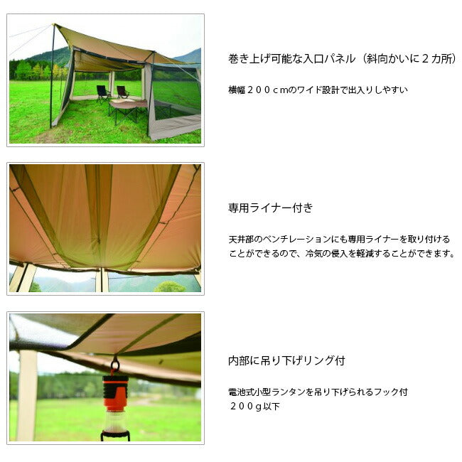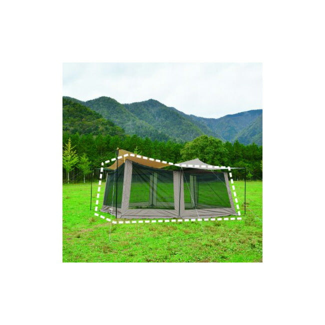 シェードが付いてシェルターとしても使えるメッシュウォールがTANカラーでリニューアル! REVOタープLをより快適にするオプション。 通気性を確保しながらも不快な虫や雨風の侵入を軽減します。 内側にシェードが追加され、外気もシャットアウトできます。 ※メッシュウォール単体での設営はできません ※ポール、ペグ、ハンマーは付属しておりません ※推奨ポール:REVOポール240×2・180×4 推奨ペグ:パワーペグSUS400又は300×8 ※(廃盤品番:681190)REVOタープL (廃盤品番:681350)2013年以前のREVOタープ 上記の2品番にもご利用いただけます 【材質】 ■生地部 ポリエステルリップストップ75D ■メッシュ部 ポリエステル 【セット内容】 天井用ライナーシート、雨水用張縄、 補修用メッシュ、ポールケース、ペグケース、収納ケース |