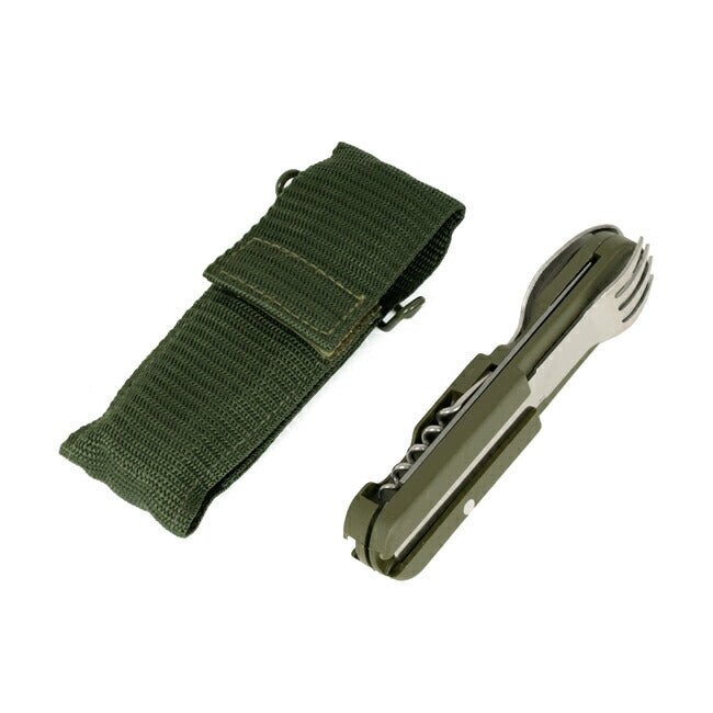 スプーン/フォーク/ナイフ/缶切り/栓抜きの5種を搭載したマルチツール。