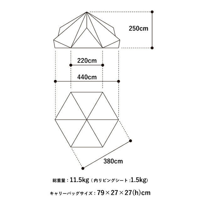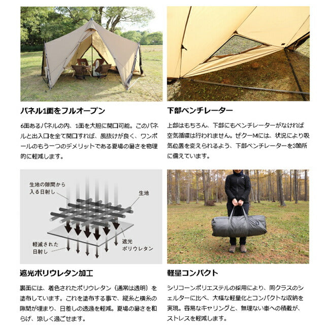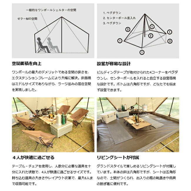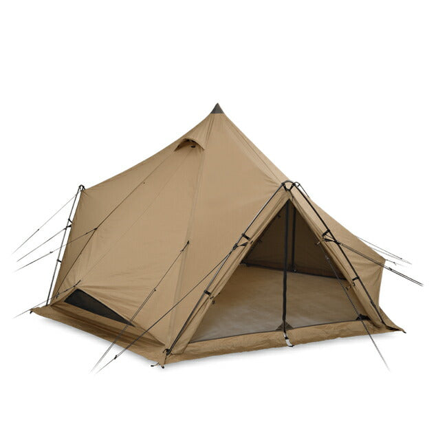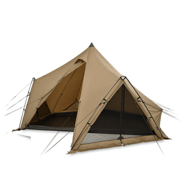 エクステンションフレームで生まれる広い空間と、大胆に開口するパネルで、ワンポールのデメリットを解決したミドルサイズシェルター。 【本体×1】 75Dシリコーンポリエステルリップストップ・遮光PU加工(耐水圧1,500mm) 【リビングシート×1】 150Dポリエステルオックス・PU加工(耐水圧1,500mm) 【センターポール×1】 A6061・φ30mm・全長250cm 【エクステンションフレーム×3】 A6061・φ16mm 【3mロープ×21】 ポリプロピレン・φ4mm 【1.5mロープ×3】 ポリプロピレン・φ4mm 【キャリーバッグ/ポールケース/ロープケース×各1】 150Dポリエステルオックス |