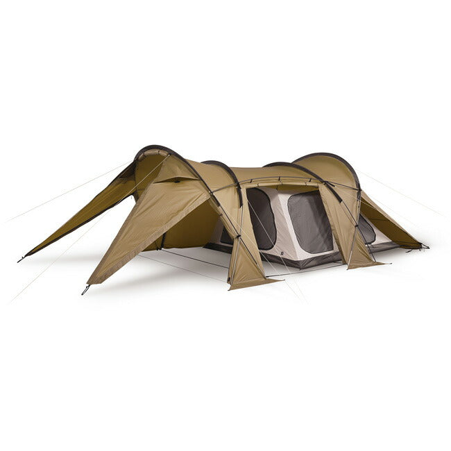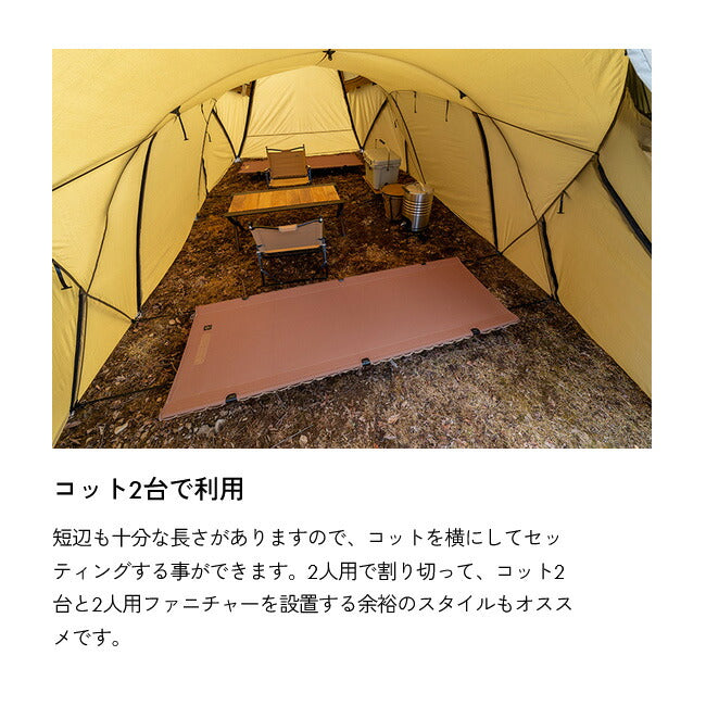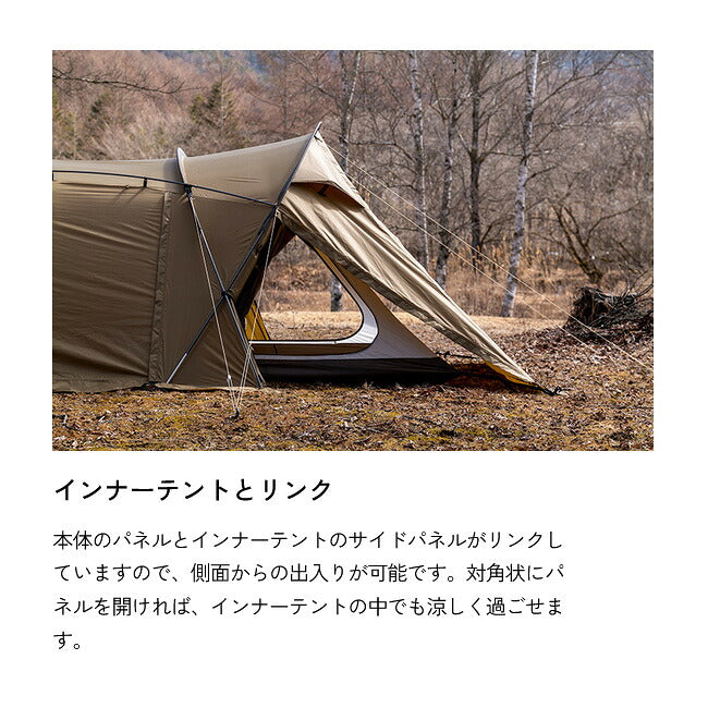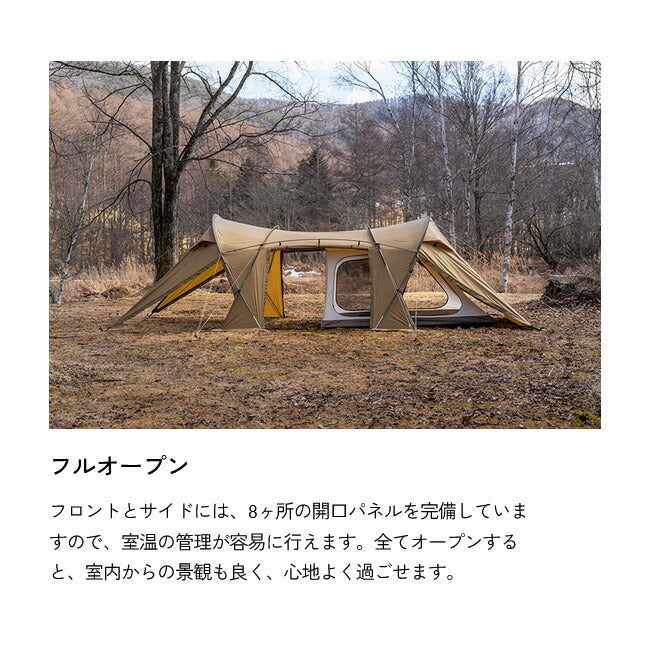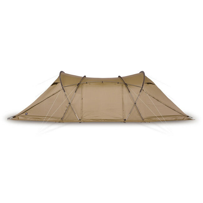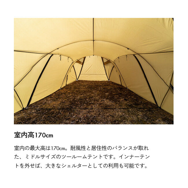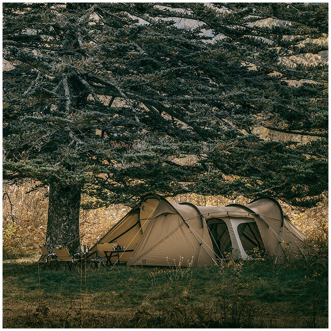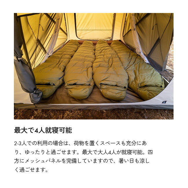 2-3人用のミドルサイズツールームテント。 ブリッジフレームを用いた独自のフレームワークで高い耐風性を確保。 【機能】 ・高い耐風性 サイドのブリッジフレームにより、独立した2つのクロスフレームが連動し、高い耐風性を実現。 少ないフレームワークで最大の効果を生み出すゼインアーツのオリジナル構造。 ・室内高170cm 耐風性と居住性のバランスが取れた、ミドルサイズのツールームテントです。 インナーテントを外せば、大きなシェルターとしての利用も可能です。 ・2-3人使いに最適 テーブル・チェアを使用し、必要な道具を十分に入れた状態で、2-3人が快適に過ごせるサイズです。 厳選された道具で、ミニマムにキャンプを楽しみたい方に最適です。 ・コット2台で利用 短辺も十分な長さがありますので、コットを横にしてセッティングする事ができます。 2人用で割り切って、コット2台と2人用ファニチャーを設置する余裕のスタイルもオススメです。 ・最大で4人就寝可能 2-3人での利用の場合は、荷物を置くスペースも充分にあり、ゆったりと過ごせます。 最大で大人4人が就寝可能。 四方にメッシュパネルを完備していますので、暑い日も涼しく過ごせます。 ・フルオープン フロントとサイドには、8ヶ所の開口パネルを完備していますので、室温の管理が容易に行えます。 全てオープンすると、室内からの景観も良く、心地よく過ごせます。 ・全周のスカート ボトムの全周にスカートが付いていますので、冷え込む時季の冷気の入り込みを緩和します。 生地には遮光性のあるコーティングを施しており、一年を通じて快適にご利用いただけます。 ・インナーテントとリンク 本体のパネルとインナーテントのサイドパネルがリンクしていますので、側面からの出入りが可能です。 対角状にパネルを開ければ、インナーテントの中でも涼しく過ごせます。 ・軽量コンパクト シリコーンポリエステルの採用により、同クラスのシェルターに比べ、大幅な軽量化とコンパクトな収納を実現。 容易なキャリングと、無理ない車への積載が、ストレスを軽減します。【素材】 ファブリックにはポリエステルリップストップを採用。 表面にシリコーン、裏面にポリウレタン(PU)を加工する事で、高いレベルの引裂強度と防水性能を実現しました。 表面のシリコーン加工は、一般的に使用されるフッ素加工と異なり、生地に浸透する事で引裂強度を格段に高める効果があり、その結果、通常のテント・シェルター・タープに使用される素材よりも薄く軽い生地を選択でき、軽量で高強度の製品に仕上げる事が可能となりました。 耐水圧は、50D、75D共に1,500mmに留め、耐水圧(ポリウレタン)加工時の熱による生地劣化を抑え、引裂強度を維持しています。 フッ素は、生地表面に付着するだけなので、生地強度に及ぼす影響はありませんが、シリコーンは生地に浸透するため、生地自体の引裂強度を格段に高める効果があります。【本体×1】 75Dシリコーンポリエステルリップストップ・遮光PU加工(耐水圧1,500mm) 【インナーテント×1】 ウォール:68Dポリエステルタフタ ボトム:150Dポリエステルオックス・PU加工(耐水圧1,500mm) 【フレーム一式×6】 A6061/φ13mm・φ11mm 【3.5mロープ×4】 ポリプロピレン/φ3mm 【2.5mロープ×8】 ポリプロピレン/φ3mm 【キャリーバッグ×1】 150Dポリエステルオックス/70×25×25(h)cm 【ポールケース×1】 150Dポリエステルオックス 【ロープケース×1】 150Dポリエステルオックス 【総重量】 11.5kg |
