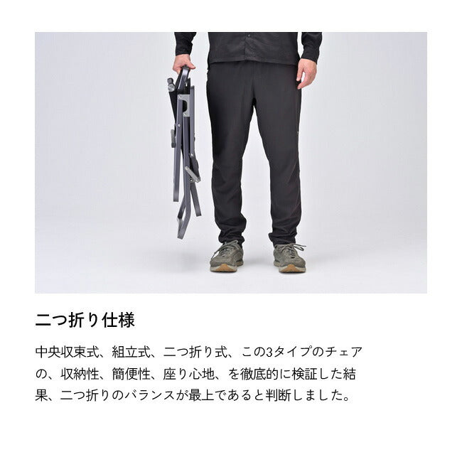 中央収束式、組立式、二つ折り式、この3タイプのチェアの、収納性、簡便性、座り心地、を徹底的に検証した結果、二つ折りのバランスが最上であると判断しました。【材質】